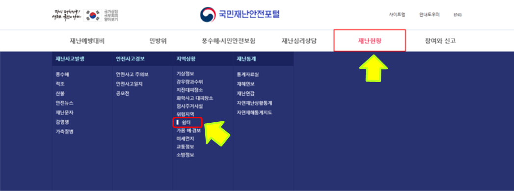 국민재난안전포털 사이트 → 재난현황 → 지역상황 → 쉼터