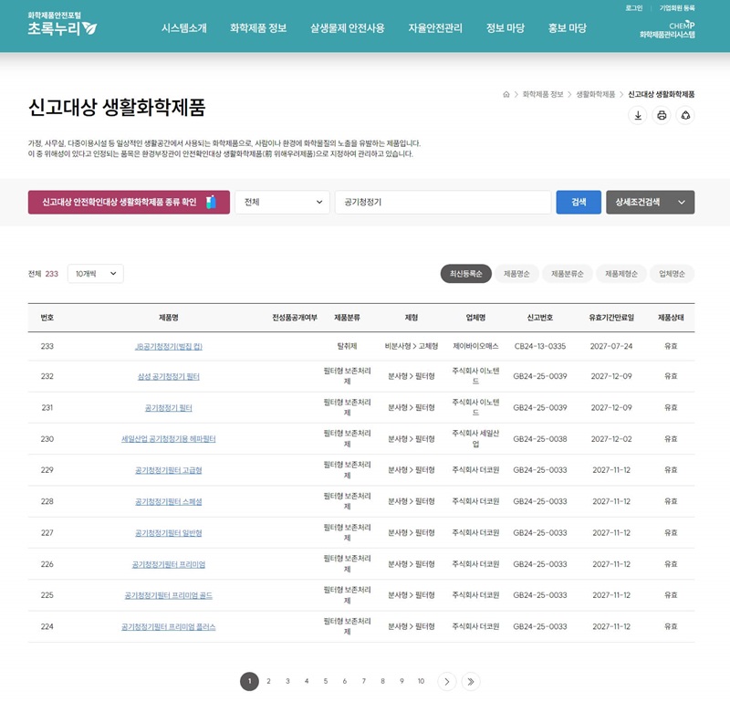 그러면 신고대상 생활화학제품 리스트가 뜬다.
