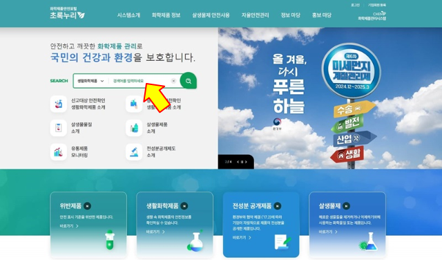 초록누리는 국민의 생활안전을 보호하기 위해 화학제품에 대한 다양한 정보를 종합적으로 제공하는 대국민 정보포털입니다.