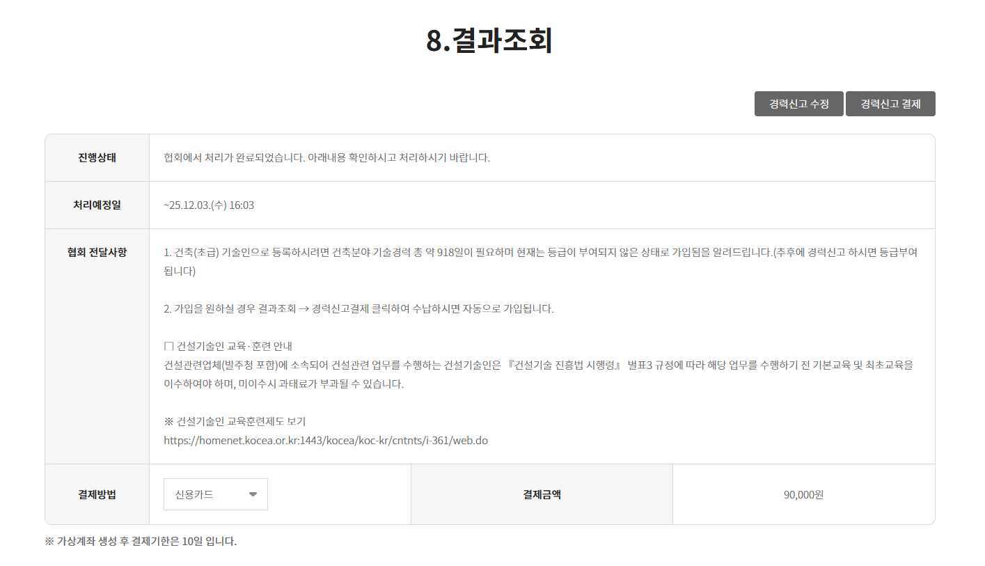 우측 상단에 경력신고 결제를 눌러서 금액을 결제하면 바로 회원가입완료란 창이 뜨고,